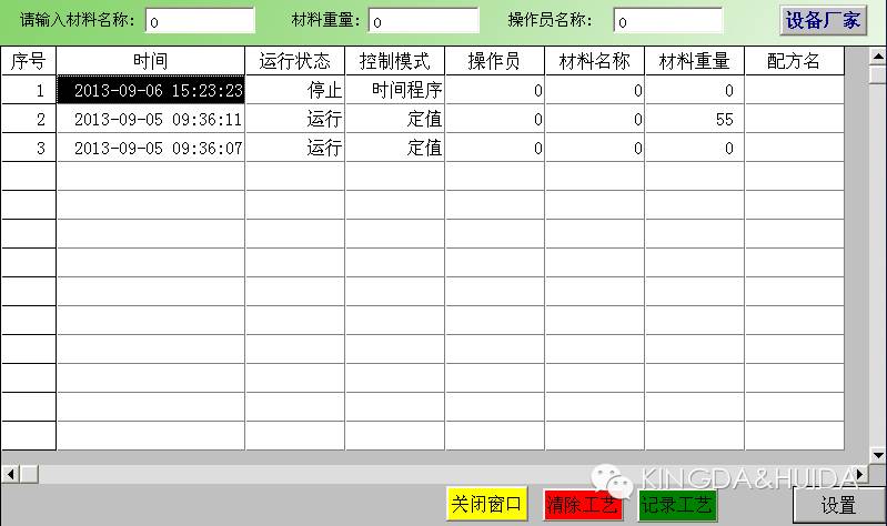记录工艺:可记录当前工艺的材料名称、材料重量、操作员名称、控温模式、运行状态、配方名。点击“记录工艺”按钮则记录一次。