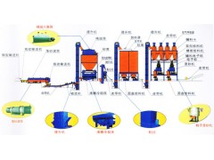 该设备是由铸型输送机-滚筒落砂机-振动输送机-皮带机-斗式提升机-精细六角筛-沸腾冷却床-圆盘给料机-螺旋给料机-电子称-转子混砂机组成,是一种涡流离心式机械再生装置,旧砂通过定量装置落在高速旋转的再生盘上,在离心力的作用下抛向四周的耐磨环。由于砂粒与耐磨环及砂粒之间相互的碰撞与摩擦,砂粒表面的粘结膜被去除,再生后的砂从耐磨环和再生盘间落下。与此同时,和再生盘同处一轴的风机向上鼓风,形成强气流对下落的砂子沸腾、风选、去除粘结膜和灰尘,从而得到满足工艺要求的再生砂。旧砂处理后死粘土含量低、新砂加入量少、混制后型砂湿压强度高、流动性气性好。