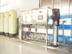 纯净水设备,同泰纯净水设备,反渗透设备: 原水(自来水、地表水、地下水)经过预处理系统(包括石英砂过滤器、活性炭过滤器、阳离子软化器),精密过滤器,通过高压泵将原水送至反渗透装置直接产出产品水称为单级反渗透。 单级反渗透,适合电导率