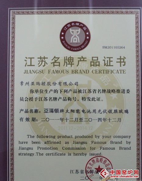 近日,亚玛顿公司收到江苏省名牌战略推进委员会颁发的"江苏名牌产品"证书,获证产品为“亚玛顿”牌太阳能电池用光伏镀膜玻璃。