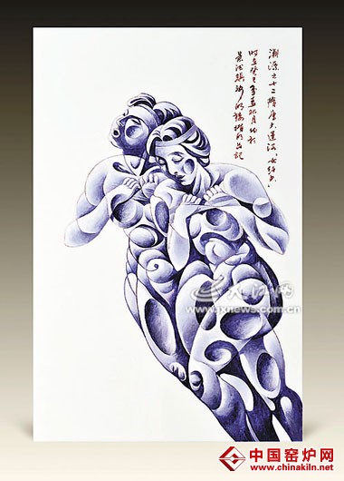 在工艺制作上,单色的蓝被不规则的圆分割处理,以深浅、明暗突显立体和肌肉的块面,集合了素描、现代装饰、雕刻等多种,人物被以抽象地方式具象地表达着,这正是陶瓷工艺以现代手法创造新陶瓷美学的最好例证。
