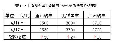 清明小长假过后,华北主导钢厂出厂价普遍持稳运行,市价则趋强整理,华东、华南地区亦采取节后补涨措施,贸易商盼涨心切,对后市充满期待。4月开市后首周,全国带钢市场整体呈现出小幅拉涨态势,价格变动如下表所示。