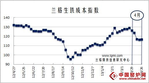 从图1生铁成本指数走势图可以看出,4月份四周的成本指数先降后稳,在116.3~123.8区间震荡,整体较3月份下跌7.1%。