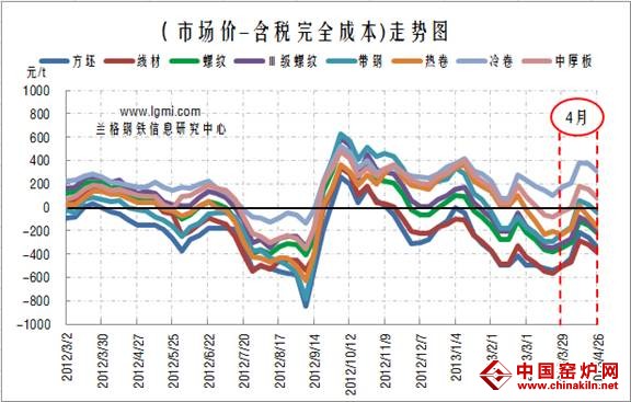 图2是信息研究中心监测的各主要钢材品种的盈利能力曲线对比。从图2可以看出,4月份8大品种中,仅有冷卷和中厚板盈利,其余6个品种均显示亏损。4月份扭亏为盈的品种为中厚板。总体上8大品种在4月份的盈利水平较3月份有所提高。