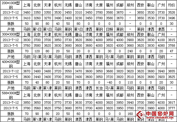 概述:本周国内H型钢市场价格盘整向上,在外矿以及钢坯价格持续攀升的情况下,国内型钢钢厂涨价频率增加,甚至有个别钢厂一日上调两次出厂价格,这就导致后期市场到货成本增加,商家信心再度恢复,虽然市场成交没有很大起色,但是在成本的支撑之下,商家也会紧随其后的。截止本周五收盘,全国14个主要市场平均价格情况:200*100H型钢全国均价3526元/吨,环比上周价格上涨30元/吨;300*300H型钢全国均价3815元/吨,环比上周价格上涨47元/吨;400*200H型钢3655元/吨,环比上周价格上涨30元/吨;588*300H型钢3817元/吨,环比上周价格上涨40元/吨,详见下表。