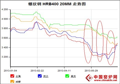笔者选取了西南地区比较有代表性的几家钢厂,从他们的调价中分析其对市场价格的影响。从图8中中我们不难看出,在整个4月到5月这段时间,这三家本土主导钢厂的出厂价格基本以平稳为主,个别时候出现了微幅的下调,这对当时的市场价格形成了有力的支撑;而进入6月份以后,这三家钢厂的出厂价格均出现了超过200元/吨的跌幅。钢厂出厂价格的下跌势必会对市场价格形成向下的压力。