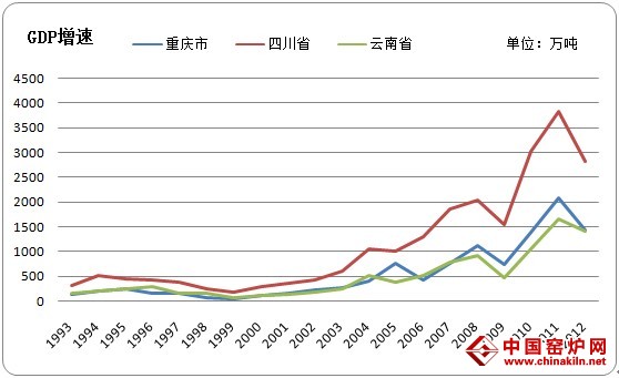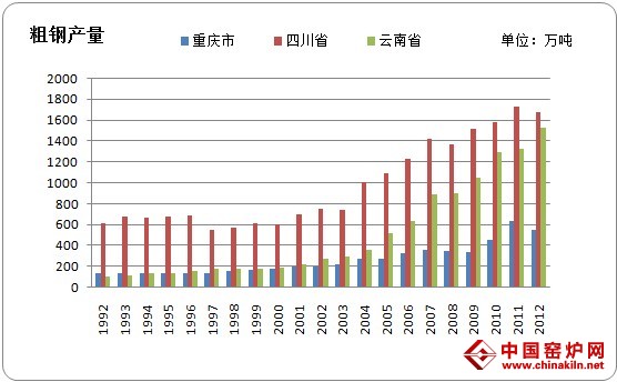 在过去的二十年当中,伴随着中国经济的高速发展,中国钢铁生产企业的产能也步入了一个快速扩张的阶段,从图2中我们可以看出,1992年-2002年这10年间,整个西南地区的钢厂产能维持相对平稳,云川渝三省市的粗钢总产量在1000万吨左右,而到了2011年,三个省市的总粗钢产量达到了近4000万吨,新增的3000万吨产量几乎都是来自最近10年,从2002年以后,云南省、四川省的粗钢产量几乎以每年200万吨的增速在快速增长,过快的产能增加以及不断新建的高炉项目,给后期的产能过剩留下了严重的隐患。
