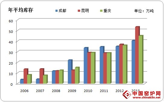 在08年汶川地震以后,本土钢厂的新增产能弥补了部分建筑钢材需求缺口的同时,大量涌入的外来资源也为本地钢材市场提供了很大的供应量,其中尤以西北、华北地区的钢厂为主,酒钢、龙钢、略钢、山西晋钢、新金山、山西建邦等厂资源已经逐渐在西南市场建立起了口碑,并且成功的占据了一定市场份额,如图3所示,四川市场的北方钢厂资源占比由2008年的3%上涨至2012年的19%,而本地主导钢厂的资源占比均有不同程度的萎缩;另外,从2012年开始,受市场需求萎缩的影响,部分华东地区钢厂的资源也开始流入西南市场,江苏中天、连云港兴鑫、丹阳龙江、安徽富鑫等厂资源悄然打入重庆市场。因此,西南三省市的年平均库存在新增产能和外来资源的双重推动下屡创新高,图4直观地展现出了在过去的几年中,西南市场建筑钢材库存的增速。