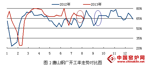 一般来说,当市场价格连续上涨时,钢厂生产积极性较高,开工率会呈上升趋势,对比图1和图2蓝色曲线标注的地方就可以发现,而红色曲线所标注的今年8月份则呈现下降走势,开工上升时间在7月中旬就很快消失。那么哪些重要因素带来如此局面?