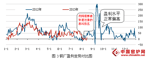 价格上涨以来,虽然钢厂逐渐扭亏为盈,但涨幅不及钢坯,利润仅仅处于正常微高水平,因此生产积极性并未大幅上涨。反而是进入8月份,持续有阶段性检修情况发生,周期普遍在3-7天,高温多雨淡季,厂家有意控制生产以避免库存过度增加。而从图3中可以看出,去年9月至10月同样是价格迅速反弹阶段(见图1),盈利水平却相对客观,从而也解释了图2中一升一降的现象。