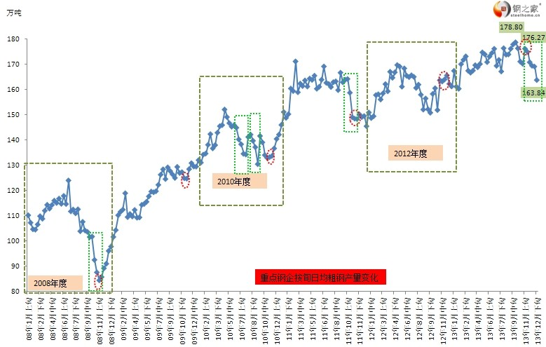 图中红圈所指的当年11月上旬的重点钢企粗钢日均产量,绿框处显示粗钢产量出现了较为明显的下降的时期