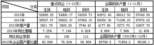 三、重点钢企生铁增产较为突出。2012年与2013年的二年间,重点钢企中有101家钢企均提供了生铁产量数据、106家钢企均提供了粗钢产量数据,以及112家钢企均提供了钢材产量数据。这些钢企2012年的生铁、粗钢与钢材年产量,占国家统计局所公布的全国产量的比重分别为80.08%,76.62%和56.95%。重点钢企生铁产量不但占全国的五分之四强,而且2013年生铁产量7.25%的年增幅,也高于2013年1-11月全国生铁产量同比增幅的6.86%;但重点钢企2013年度粗钢、钢材产量的7.14%与6.92%的增幅,均低于1-11月全国的增幅,由此可见,重点钢企生铁产量的增幅较为突出,如表1所示。