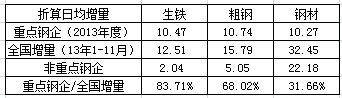 2013年上述重点钢企生铁、粗钢与钢材分别增产3821.79万吨、3920.20万吨和3749.42万吨。若按日均增量进行折算,如表2所示,重点钢企生铁、粗钢与钢材的日均增量占全国增产比重分别达到83.71%、68.02%和31.66%。83.71%的增产比例与3821.79万吨的年增产量,重点钢企对生铁产量增加的重大贡献可见一斑,同时,重点钢企对粗钢增产的贡献率也超过了三分之二。相比较,重点钢企钢材增产的比重不到三分之一,反过来说明了非重点钢企对钢铁业发展仍将重点放在轧制工艺段。