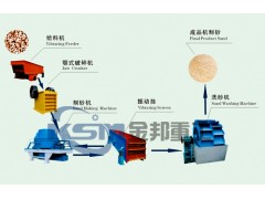 石料由振动给料机均匀地送到颚式破碎机进行粗破,粗破后的物料由胶带输送机送入到制砂机进行进一步破碎,细碎后的物料被输送到振动筛进行筛分,达到成品粒度要求的物料被送入洗砂机清洗,清洗后由成品输送带输出即为成品;未达到成品粒度要求的物料从振动筛返回制砂机重新加工,形成闭路多次循环。成品粒度可按用户的需求进行组合和分级。如果选用干法生产工艺,可配备粗细粉分离机和除尘设备。