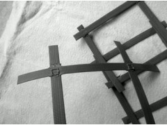 钢塑复合土工格栅以高强钢丝(或其他纤维),经特殊处理,与聚乙烯(PE),并添加其他助剂,通过挤出使之成为复合型高强抗拉条带,且表面有粗糙压纹,则为高强加筋土工带。由此单带,经纵、横按一定间距编制或夹合排列,采用特殊强化粘接的熔焊技术焊接其交接点而成型,则为加筋土工格栅。